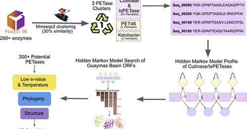 聚對苯二甲酸乙二醇酯(PET)水解酶(PETases)是一類近期發現的能夠降解塑膠的酵素。 PETases通常在細菌中被發現;然而,現有的發現流程往往傾向於篩選出高度相似的酵素。本研究利用加州灣瓜伊馬斯盆地((Guaymas Basin))受熱液影響的深海沉積物的全基因體數據,尋找PETases。我們鑑定出多種潛在的蛋白質,並根據其潛在的熱穩定性和系統發育新穎性篩選出22個。對這些候選PETases進行異源表達和功能分析,結果顯示其中三個候選酶能夠解聚PET或其副產物。其中一個是來自深海古菌(Bathyarchaeia)的PETase(命名為GuaPA,即瓜伊馬斯PETase古菌),另外兩個是來自未培養細菌-多孔菌(Poribacteria)和嗜熱菌(Thermotogota)的雙羥乙烯對苯二甲酸乙二醇酯水解酶(BHETases)。 GuaPA是第一個被發現能夠解聚PET薄膜的古菌PETase,它屬於一類特定的酶,因此具有一些預測的新型結構特徵。在48小時內,GuaPA能夠從低結晶度PET中釋放出約3-5 mM的對苯二甲酸和對苯二甲酸單(2-羥乙基)酯。含有GuaPA和一種新發現的BHETase的PET共水解反應,能夠進一步提高未經處理的PET薄膜的水解率達68%。對編碼PETase和BHETase的微生物進行基因體分析表明,它們可能代謝酶促PET解聚的產物,這暗示了它們在利用人為碳源方面發揮生態作用。我們的分析揭示了這些未培養微生物具有先前未被發現的PET分解代謝能力,顯示深海可能是塑膠廢棄物解聚生物催化劑的潛在來源。